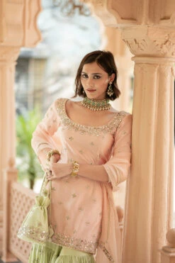 The Imperial Masai Sherwani embodies sophistication and grandeur with an understated beige palette. Tarnished anmol gold dori work, and hand embroidery using nakshi, dabka, sequins, mirror, and zardozi work adorn the regal sherwani. The kurta set is crafted in pure Banarasi booti fabric promising comfort and luxury. Pair it with The Imperial Masai Stole for a truly regal appeal. (Stole & Safa are not included)