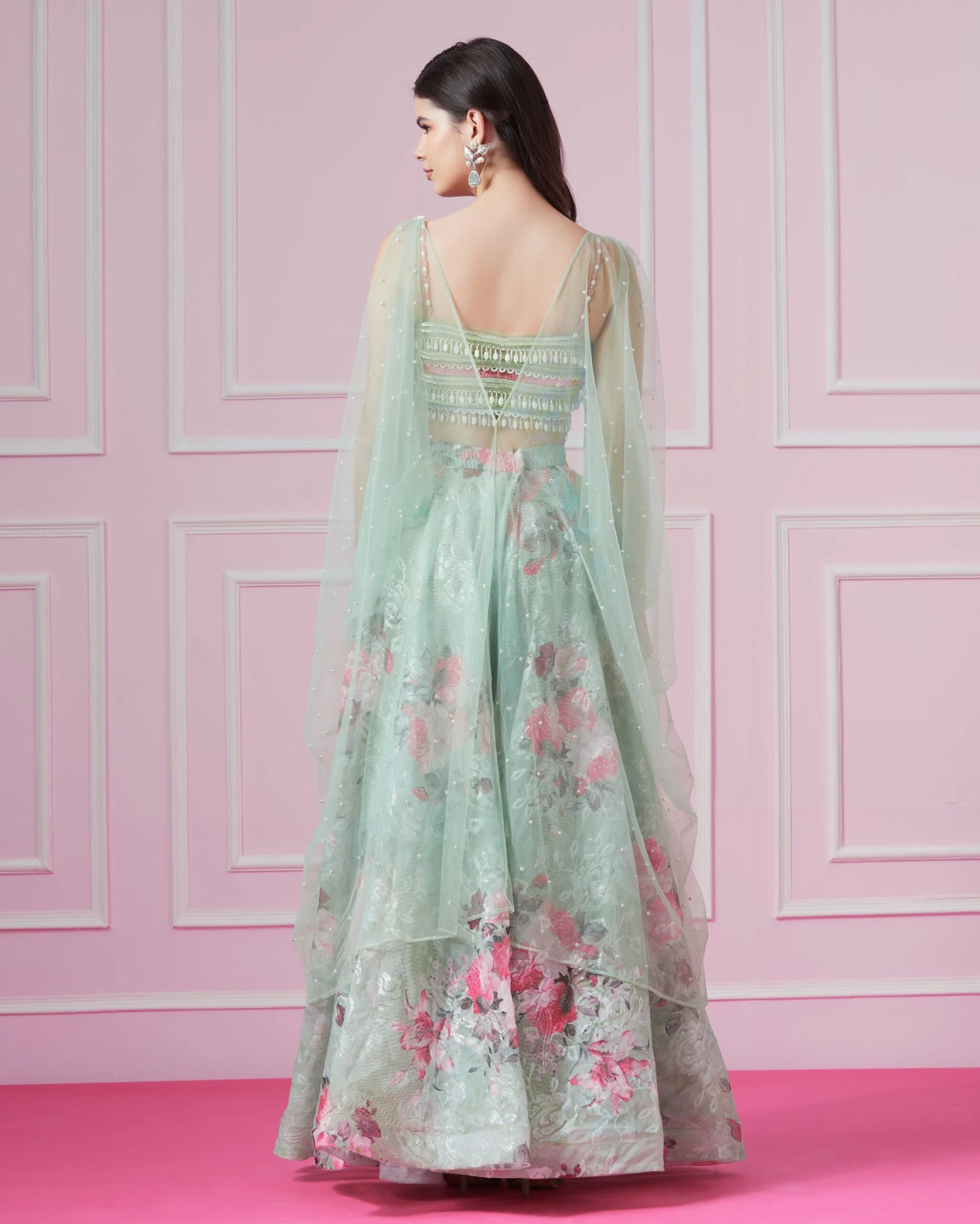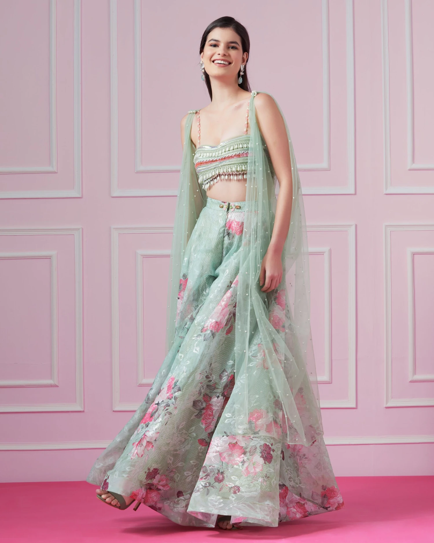 Embroidered printed organza Sharara pants with geometric printed satin lining, embroidered blouse, net cape with pearl details.