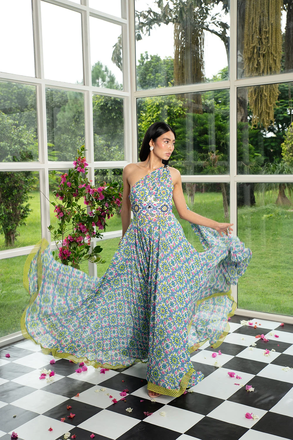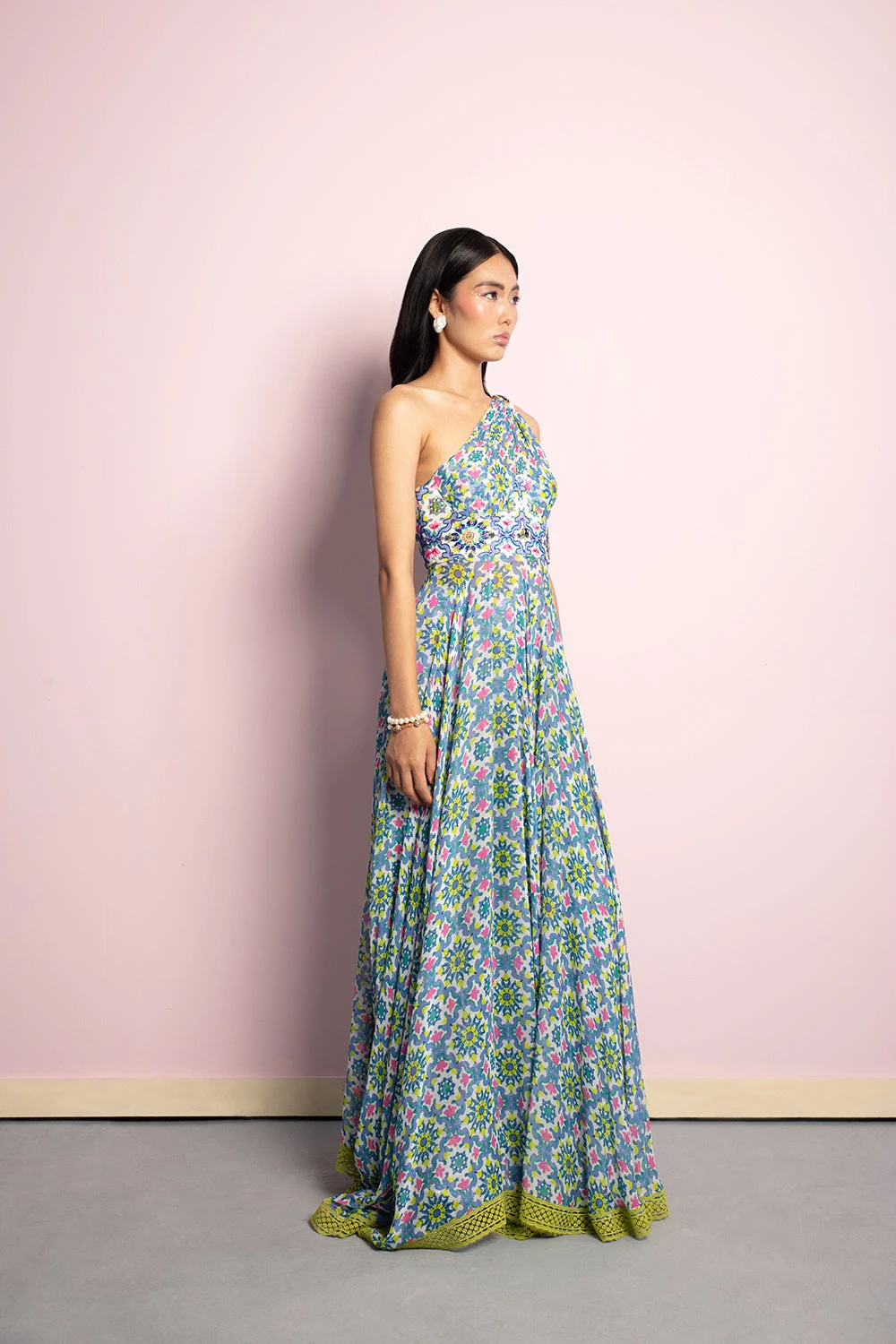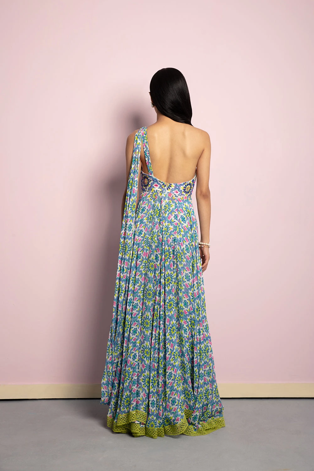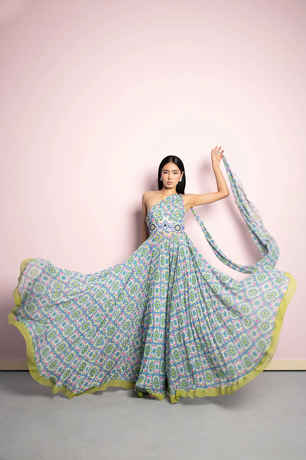 Featuring a white, lavender & lime green printed draped dress with a sequin & katdana embroidered bodice, finished with a lace border.
