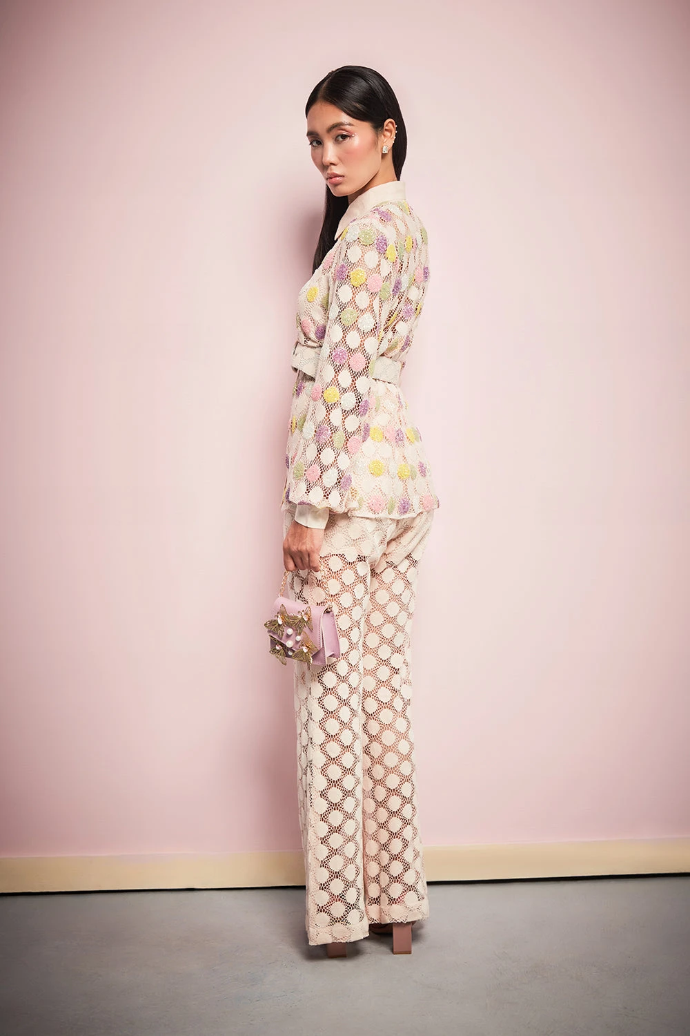 Featuring multicoloured glitter embroidered lace shirt with matching Polka dot pants and belt.