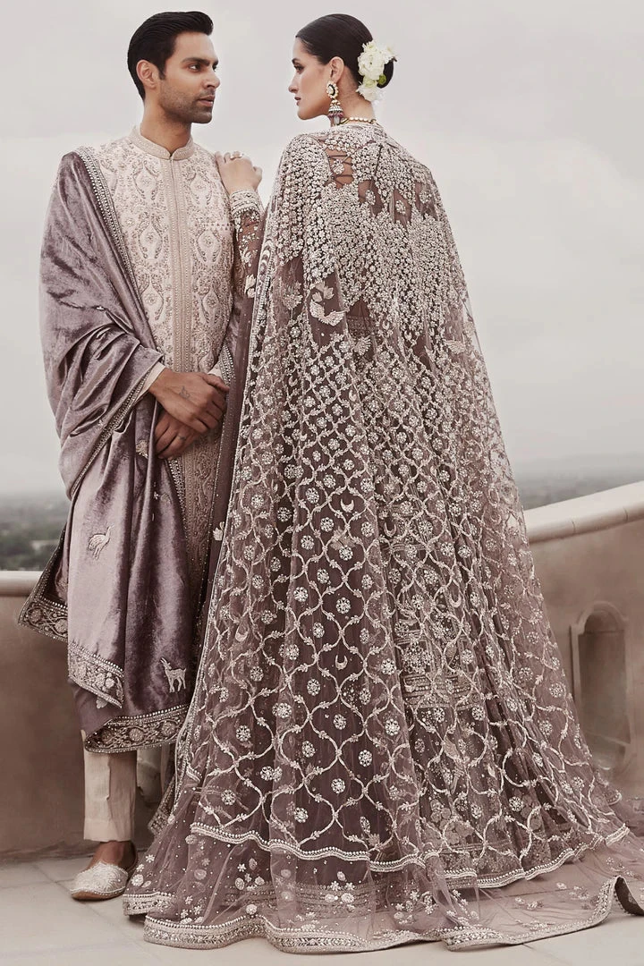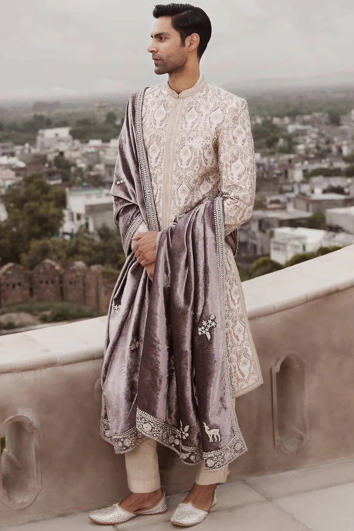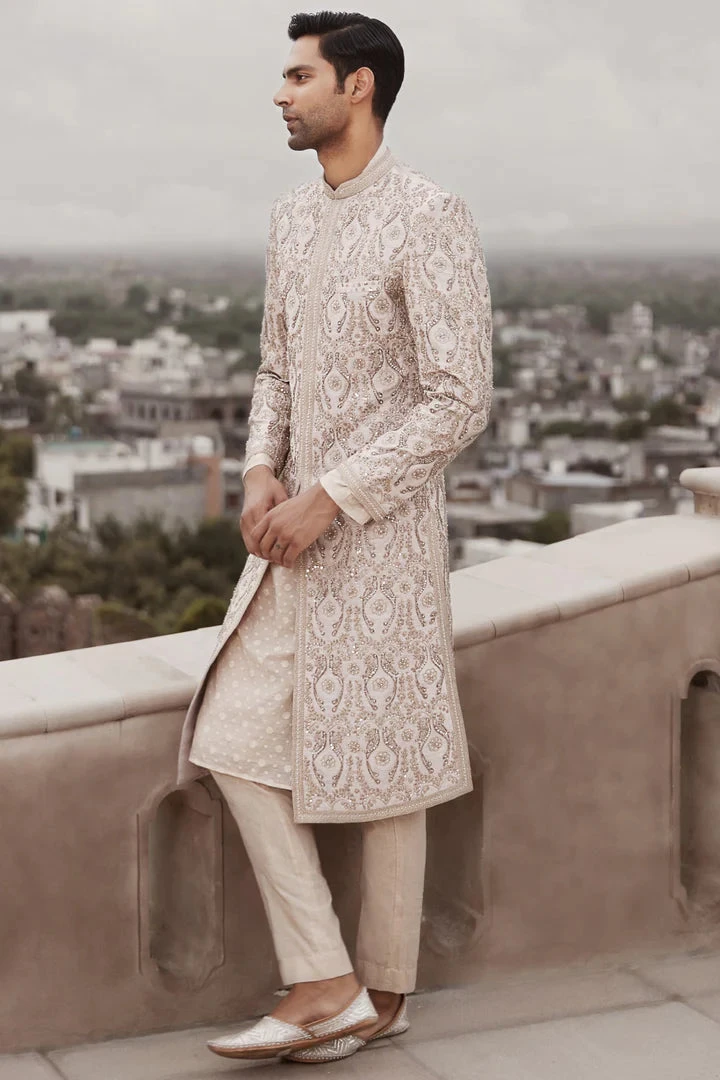 Exuding an air of modern royalty, The Royal Amanbagh Sherwani presents a sharp and sophisticated take on the grooms-wear classic. The beige raw silk sherwani featuring tarnished anmol gold dori work and hand embroidery using sequins, mirrors, and zardozi is layered over a luxe jacquard kurta set made in pure banarasi booti fabric. (Stole is not included)