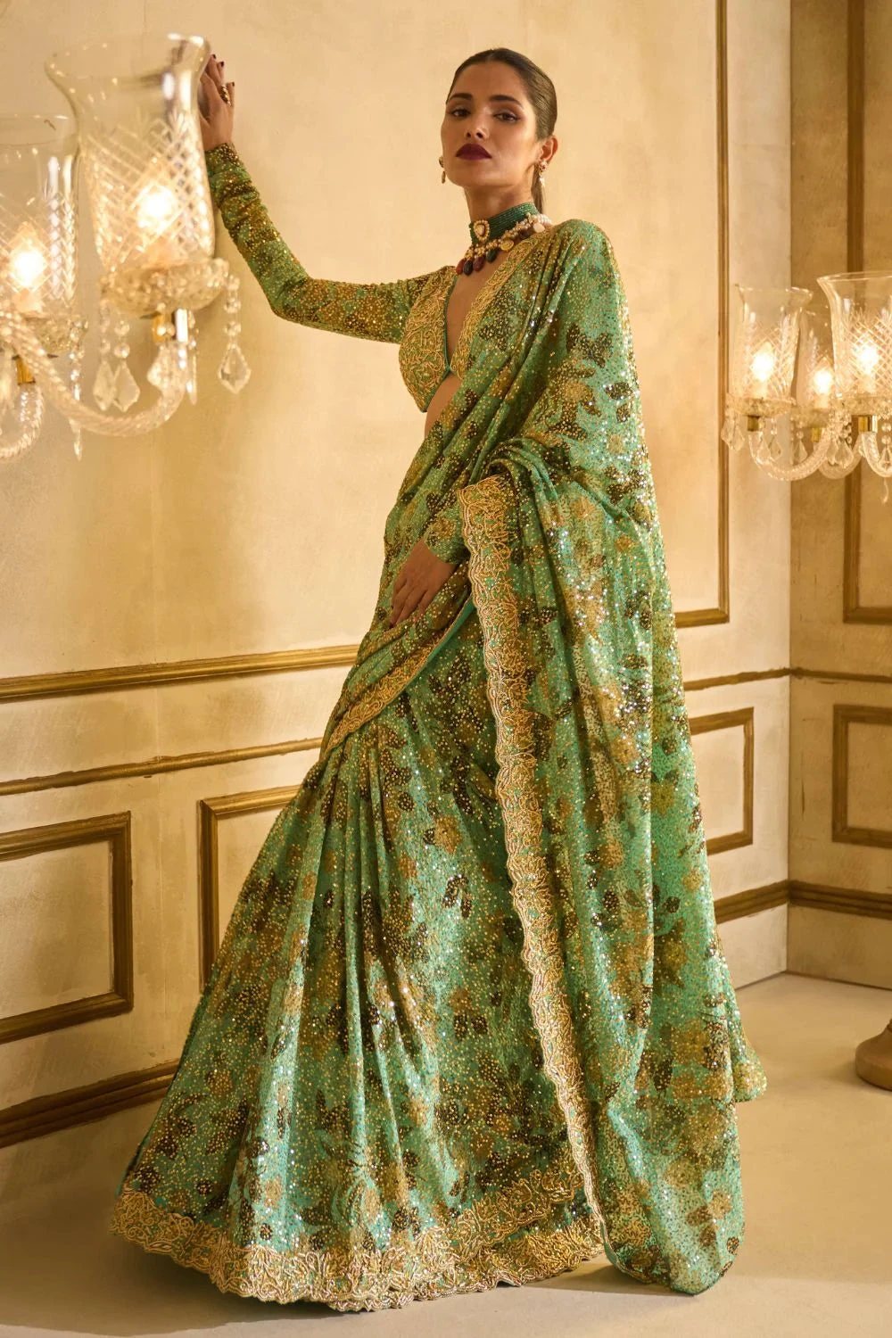Our vintage floral print ruffle saree set in georgette all over scattered hand embellished sequins with zardosi border, its lined with shantoon and layered with can can, the neck depth be made lesser or adjusted as per the preference.
