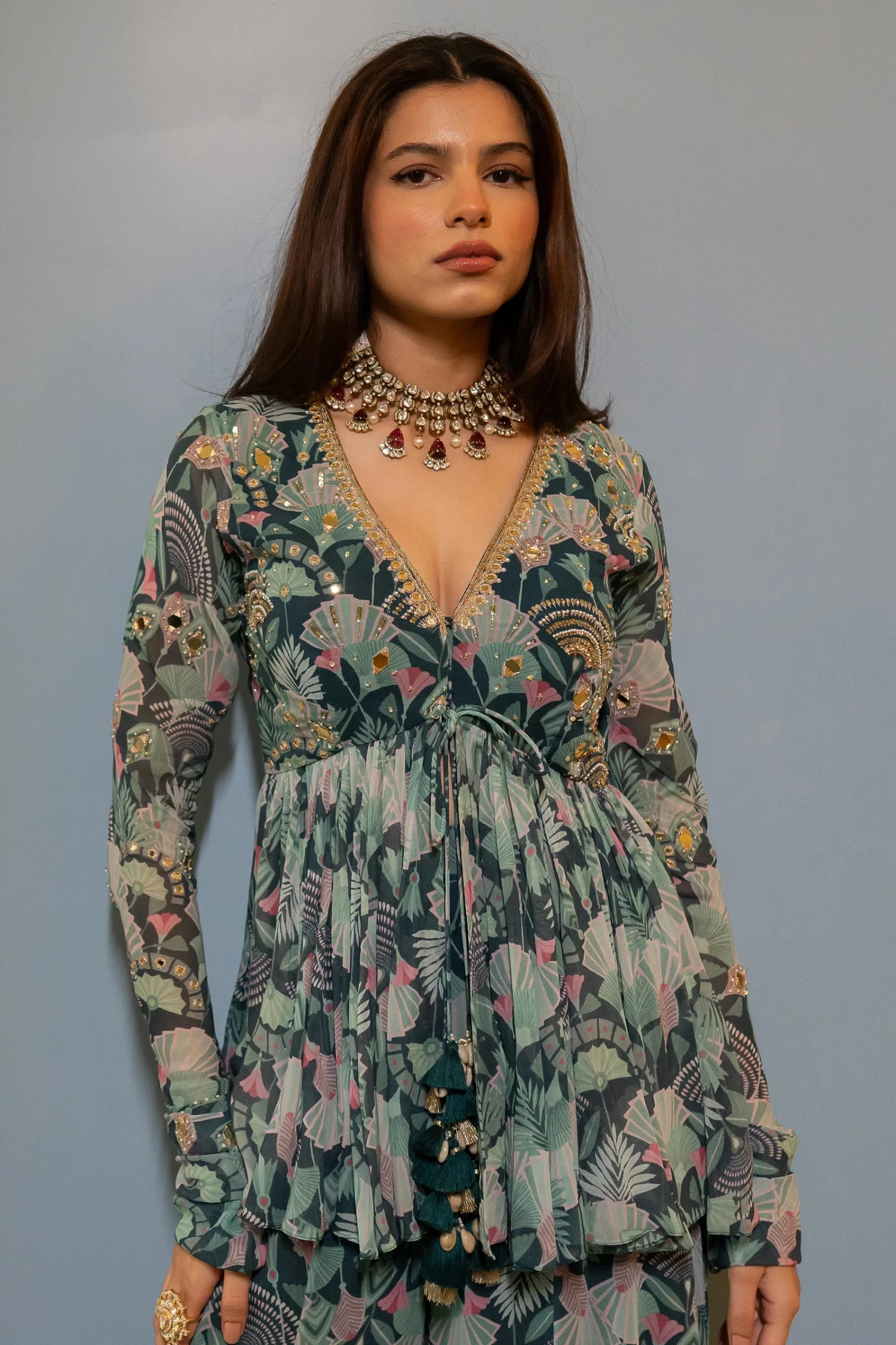 A turquoise green geometric floral printed peplum with antique gold dori, embellished with hand-embroidery and beautifully adorned with tassels, paired with printed pallazo pants.