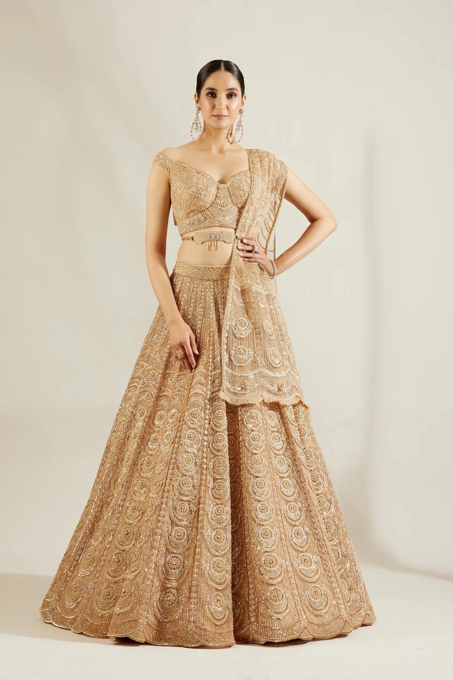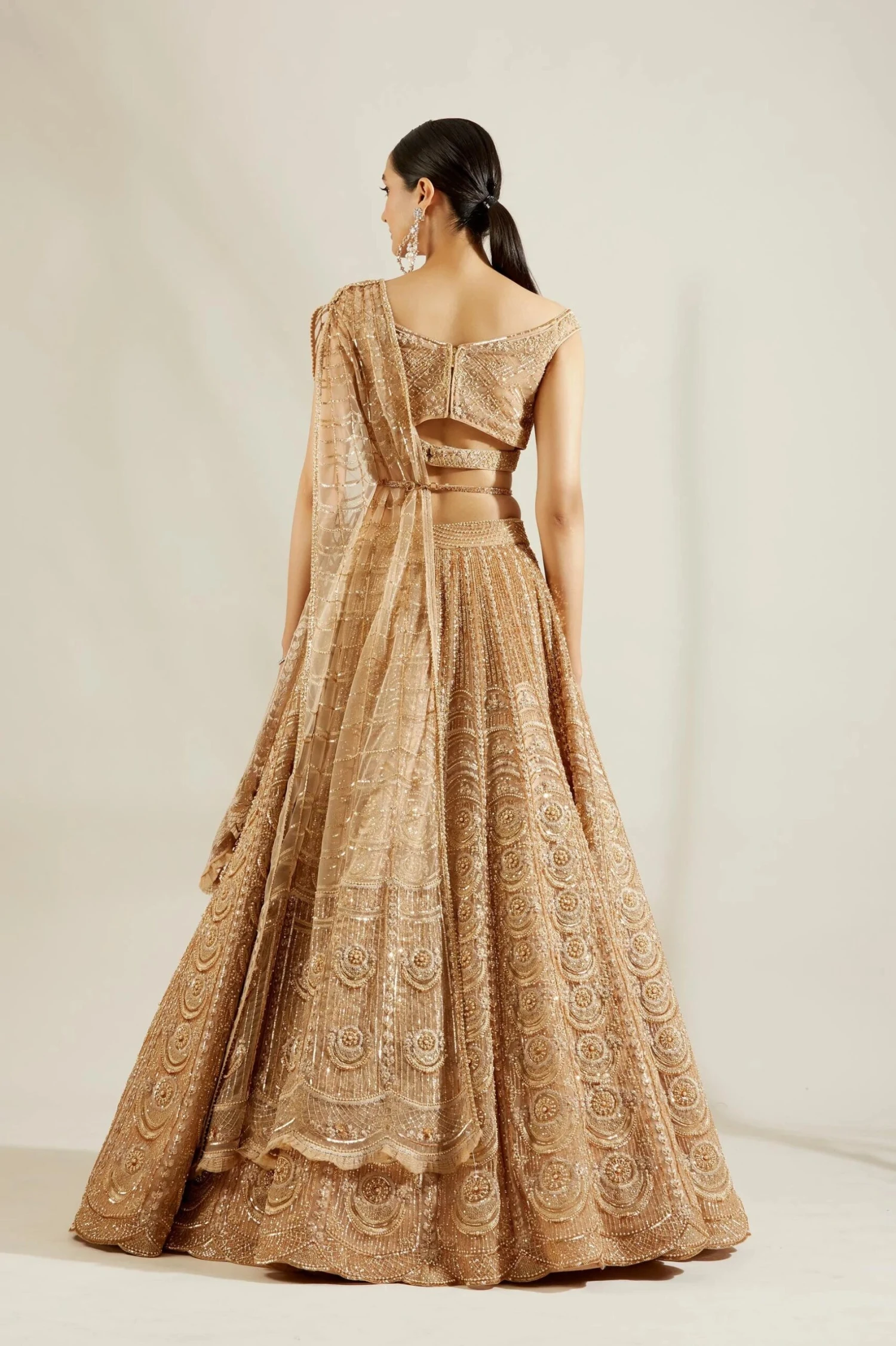 Gold lehenga with mandala & pearl embellished motifs. Paired with an off-shoulder embellished blouse, embellished dupatta & belt.