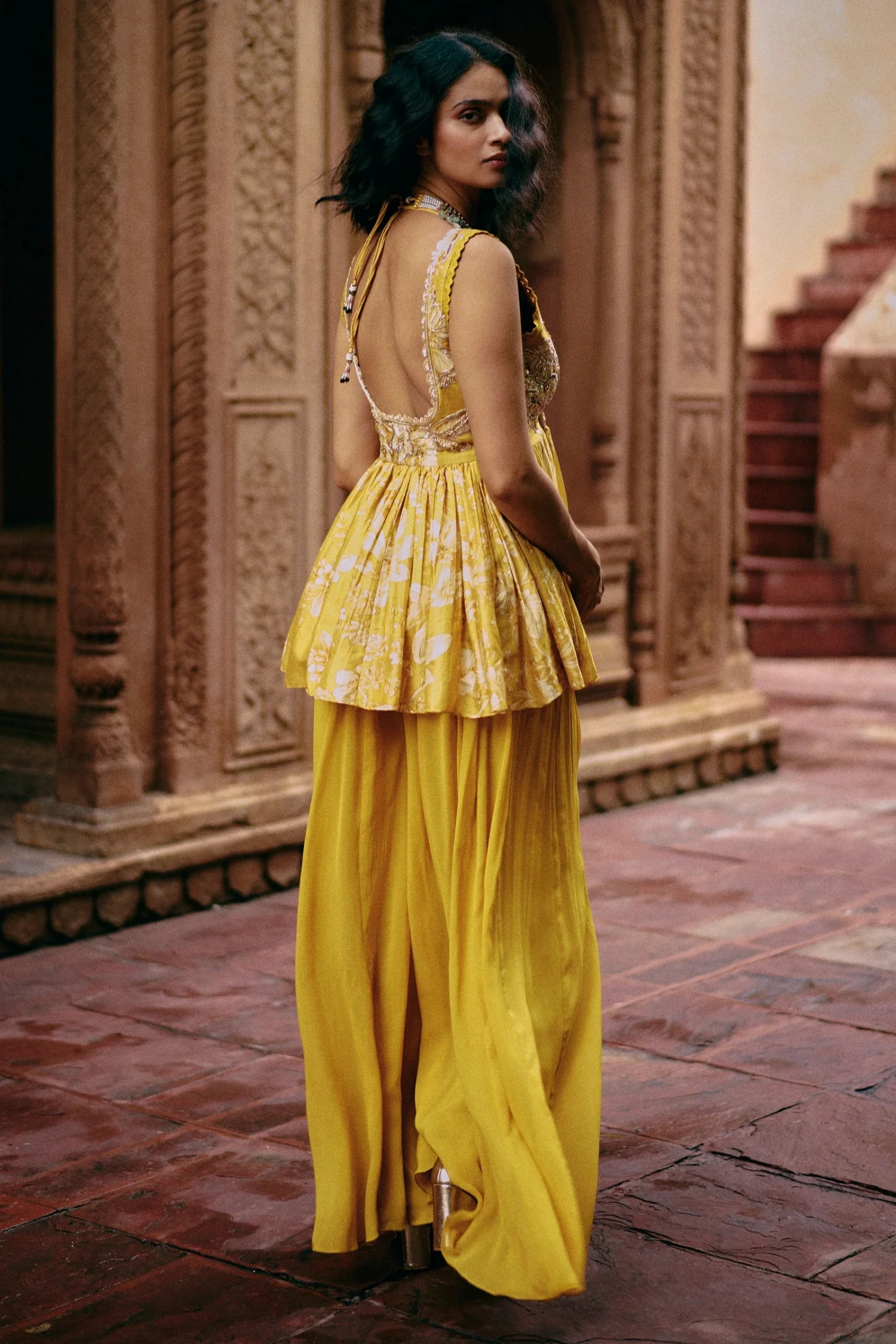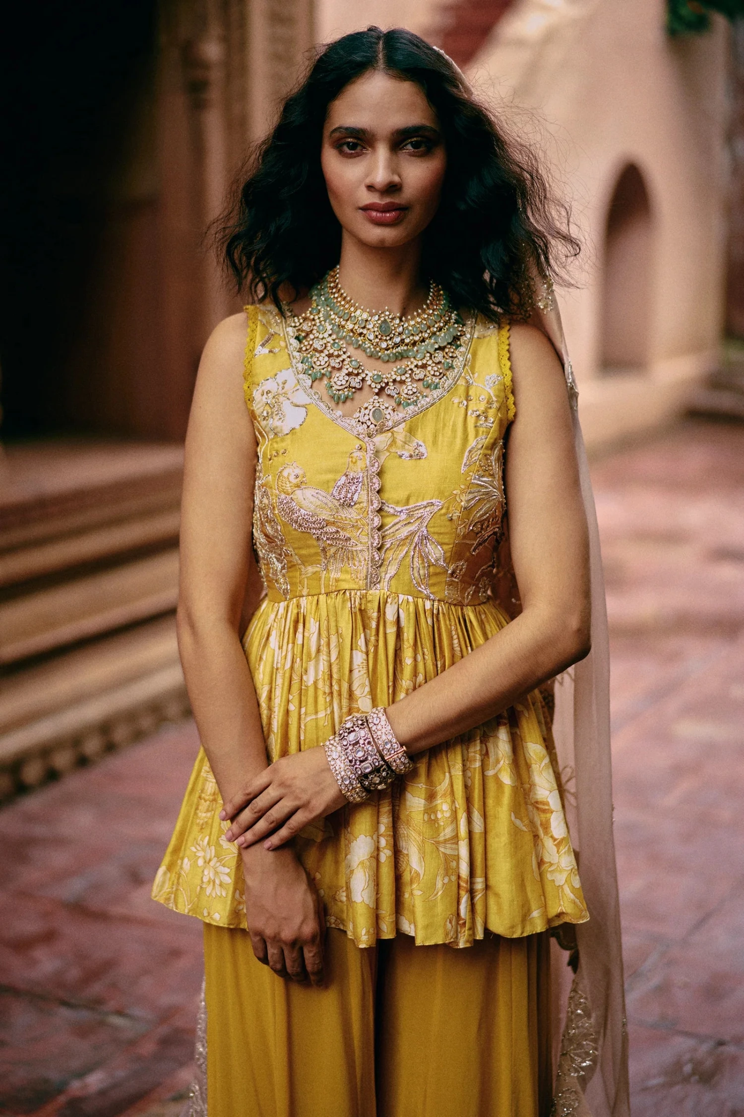 A tuscany yellow peplum set in our signature Roop flip bird print, featuring a pair of birds in their enchanting habitat. It has intricate hand embroidery on the front and back of the yoke, with hand-embroidered lace detailing. It is paired with solid palazzos.
