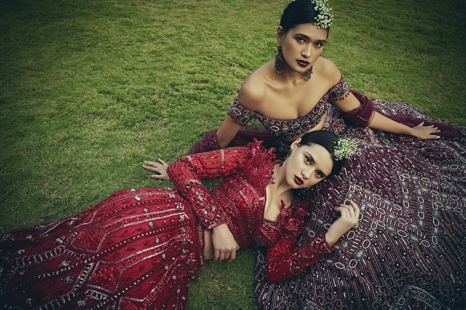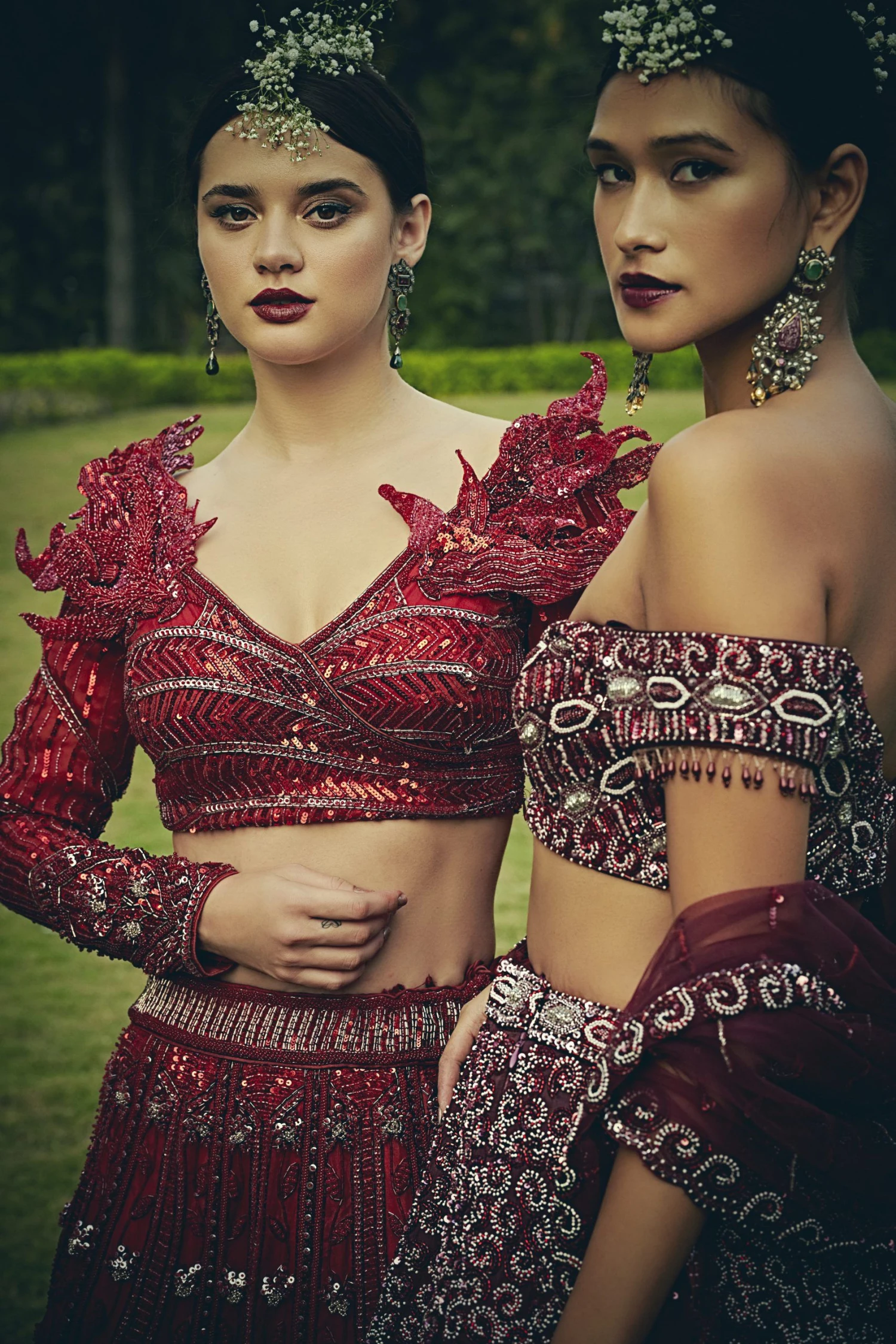 The lady Eugenia Belousora wears an urban red lehenga having brick red glass bugle beads all over it with 3D flowers paired with a full sleeves blouse having appliqued couture shoulder to steal the spotlight.