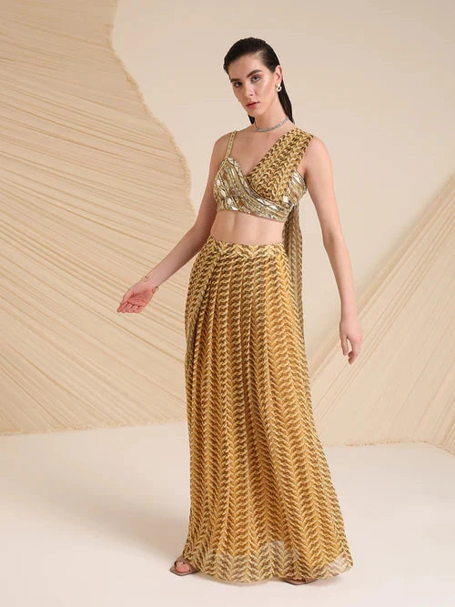 Verity: Our Verity set is for the modern women with tradition in her heart as it features printed and hand-embroidered assymetrical blouse with drape-style skirt that’ll make her twirl!
