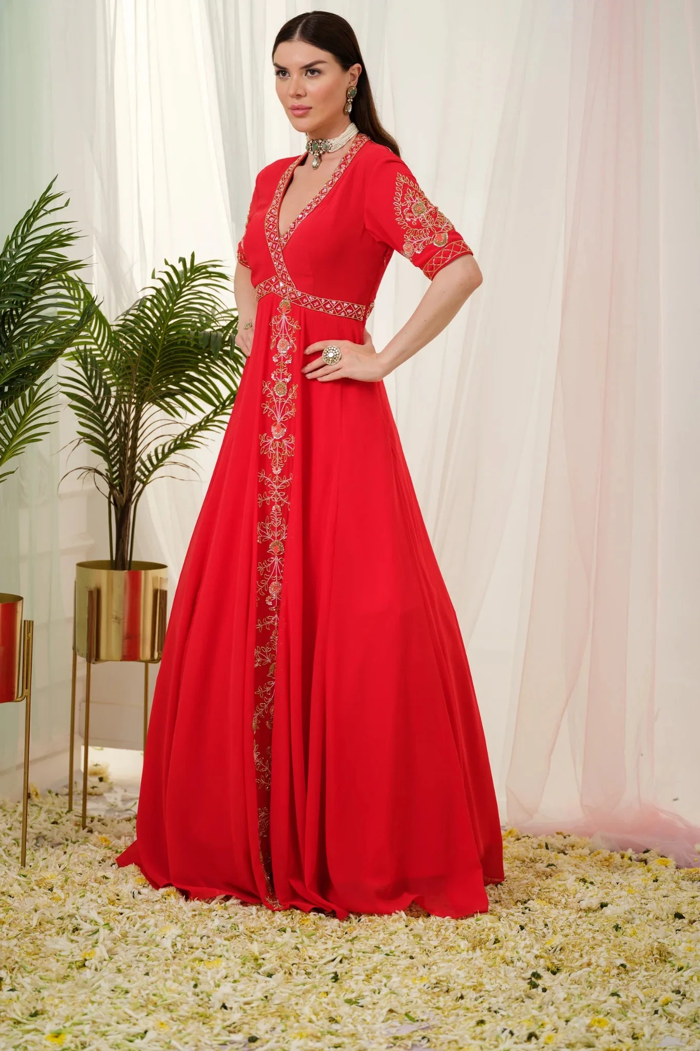 A Captivating Red Georgette Deep V Neck Kalidar Anarkali, Paired with a Silk Tissue Handcrafted Floral Cutwork Dupatta, Exuding Timeless Elegance and Sophistication.