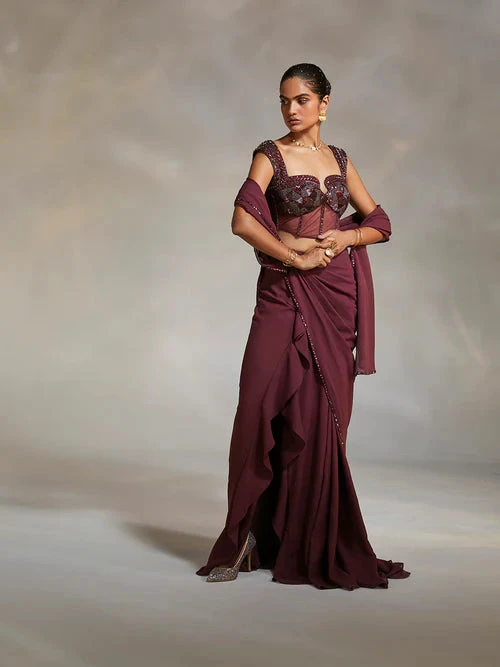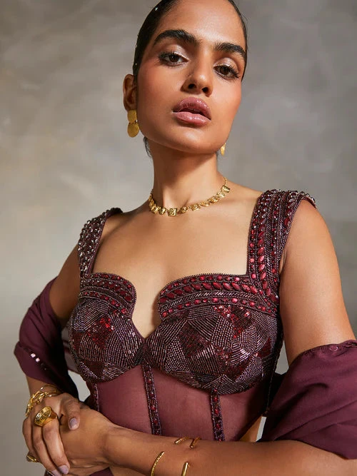 Vero: Our Vero set has an old charm, a see-through corset blouse, and deep wine color. This set is a blend of ruffle, drapes, and embellishments designed for glamorous soirees.