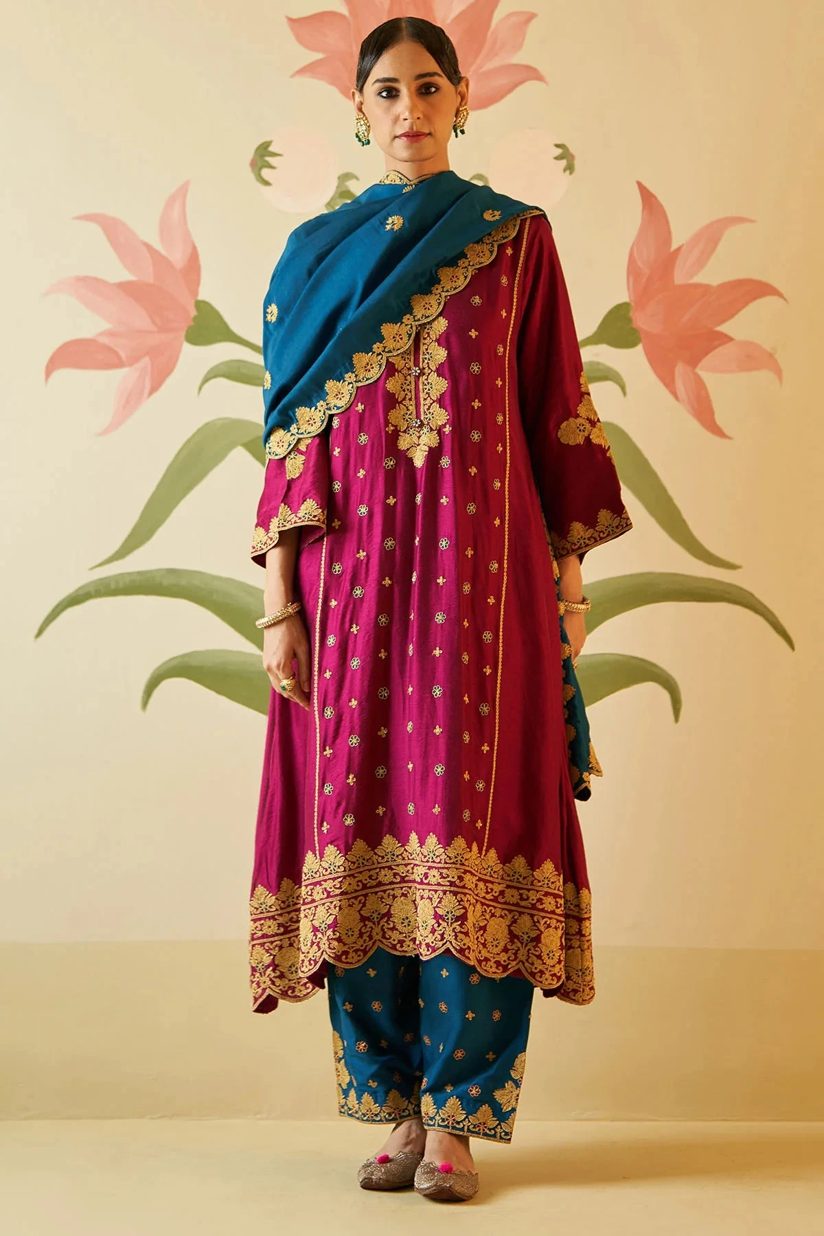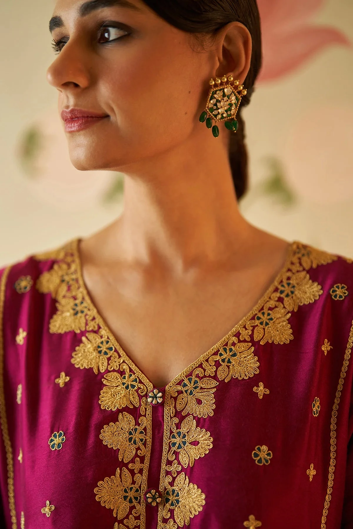 Featured is a wine chanderi choga set embroidered with gold zari.