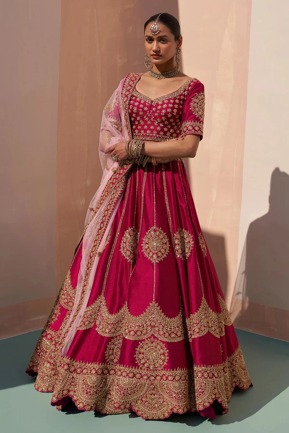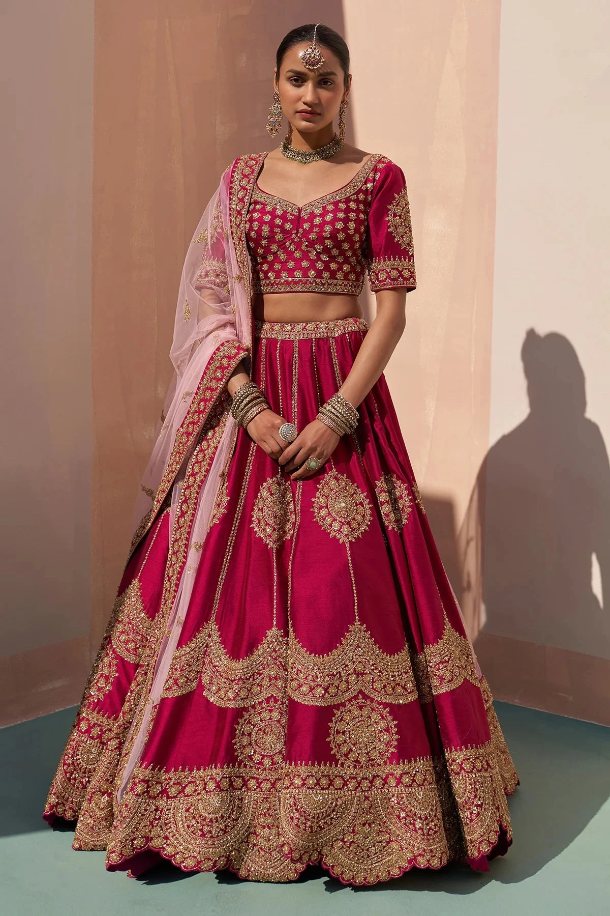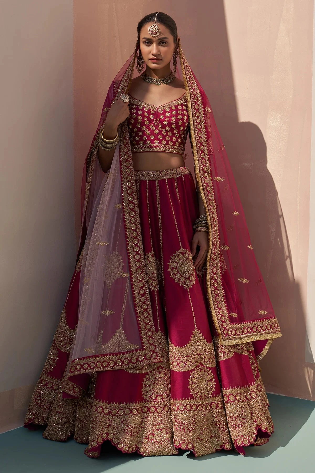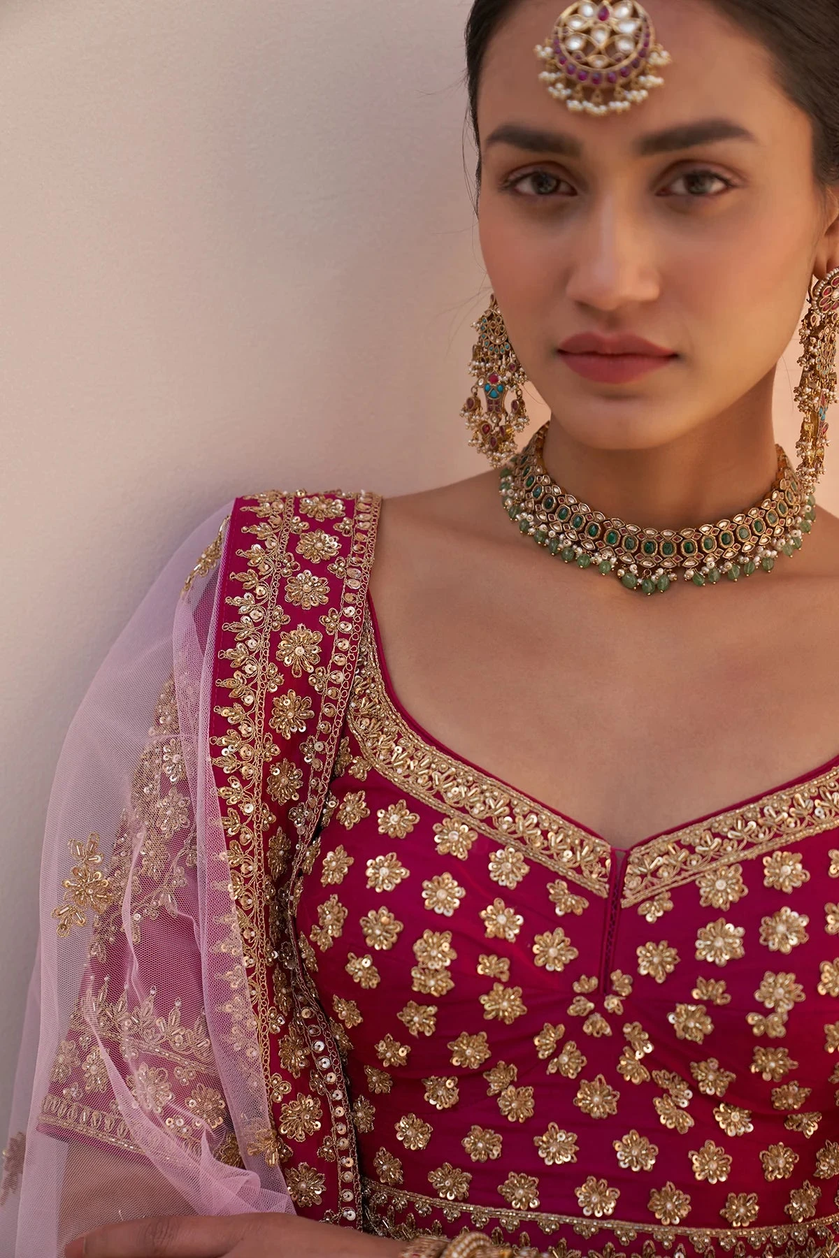 A double wine dupatta lehenga set embroidered with the traditional zardozi technique using silken threads, dabka, cutdana and sequins.