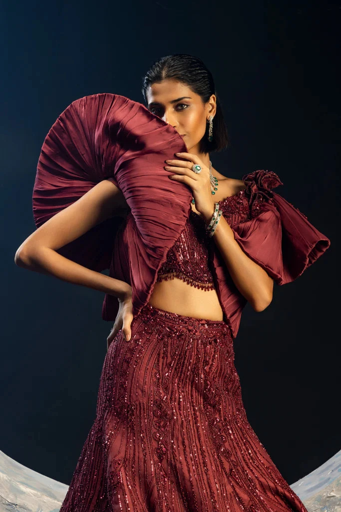 Rosewood Top & skirt with bejeweled delicate embellishments in a linear pattern, having dramatic sculpted sleeves.