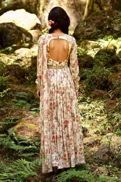 Orange Indo-Western Gown In Crepe With Tikki And Moti Hand Work
