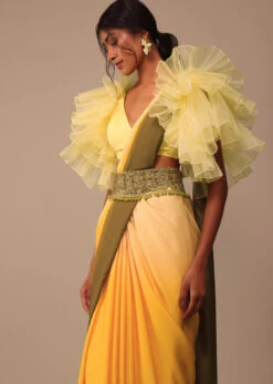 Mustard Yellow Saree With Bishop Sleeve Blouse And Hand Worked Belt