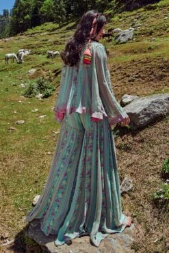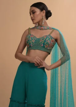 Teal Sharara And Crop Top Set With Colorful Resham, Cut Dana And Moti Embroidered Spring Blooms