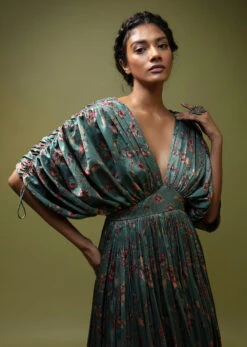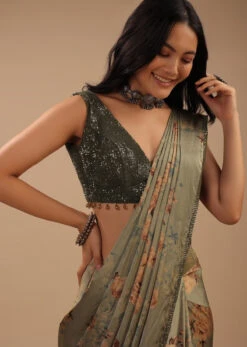 Tea Green Ready Pleated Satin Saree With Floral Print And Sequins Blouse