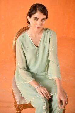 Teal Hand Embroidered Dupatta With Zardozdi Blouse And Silk Trousers