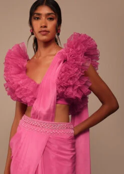 Hot Pink Crepe Indo-western Saree With Pearl Embroidered Belt