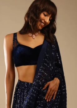 Midnight Blue Ready-To-Wear Sequins Saree With Velvet Blouse