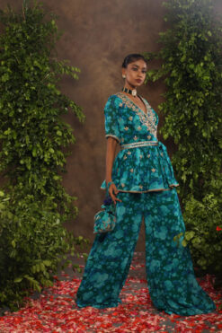 Blue Floral Printed Georgette Garara Set With Gota Patti Combined With Sequins, Pearl And Dori Work