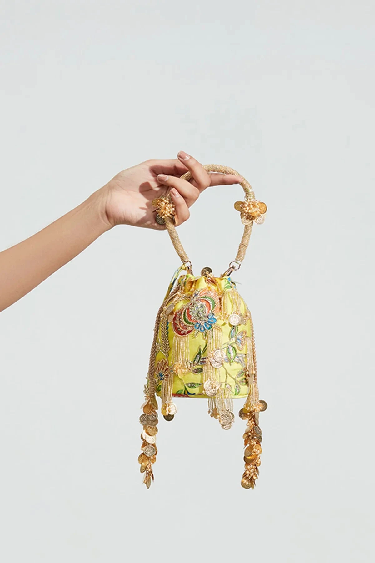Featuring a Yellow bucket bag in (fabric name ) base with Aari work of round beads and beagle beads followed by intricately embroidered pearl and coin tassels. The bag comes with a beautifully carved handle in beads, coins and pear tassels.