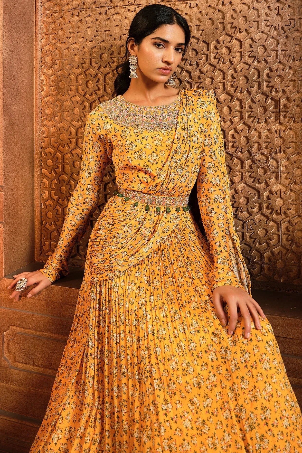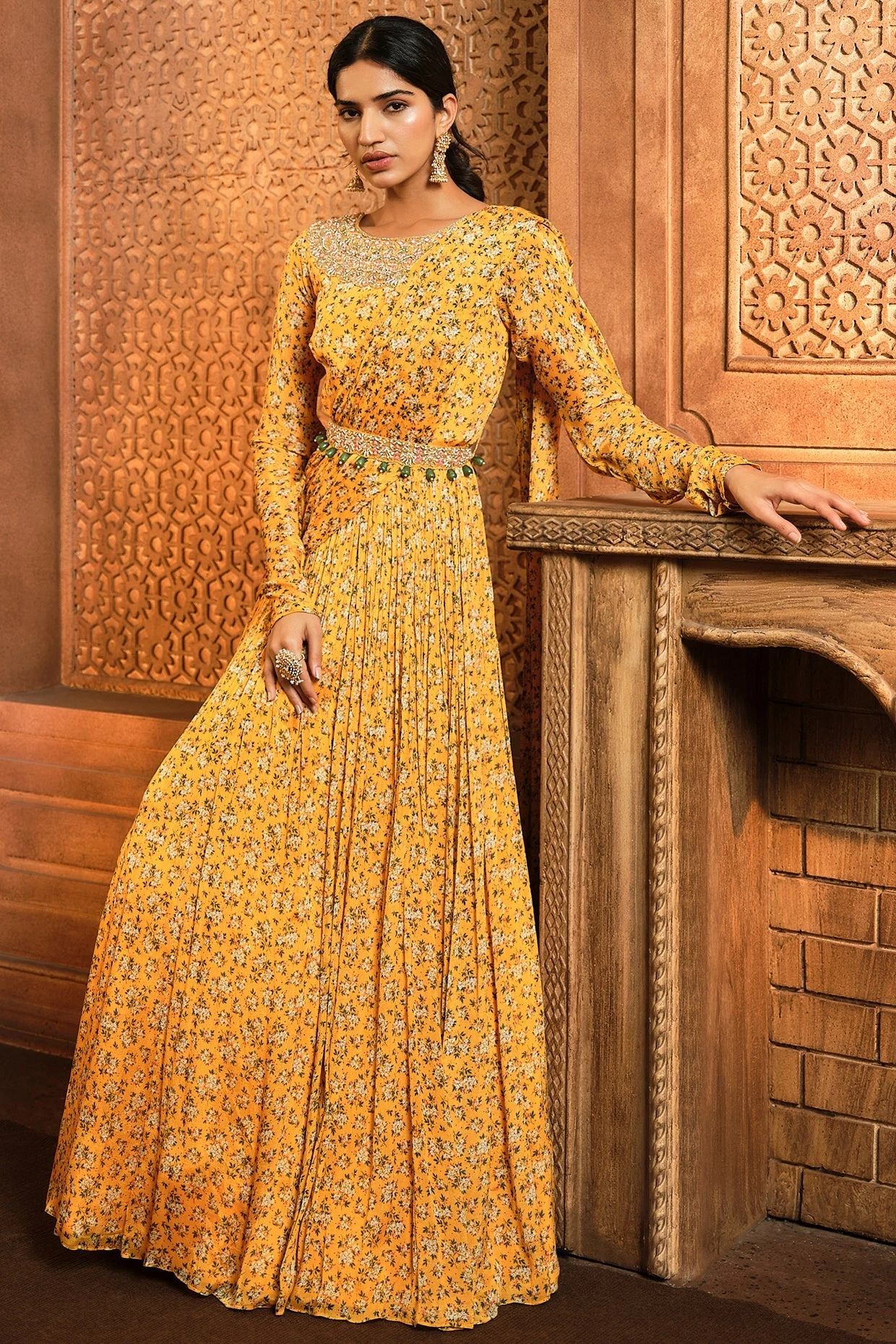 Featuring A Yellow Floral Draped Anarkali With Zardosi Embroidered Neckline. It Comes Along With Separate Zardosi Belt With Drops.