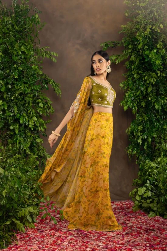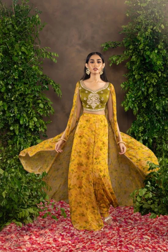 Yellow floral printed Plazo pants & cape style attached with mehndi green raw silk blouse embroidered with got patti combined with sequins and pearls.The cape has cuts for arms to be visible with embroidery details.