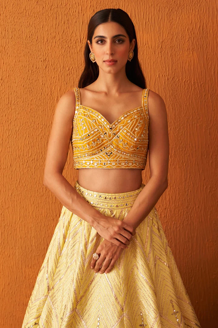 A yellow raw silk lehenga set embroidered with gota and mirror paired with a mustard blouse and purple silk dupatta.