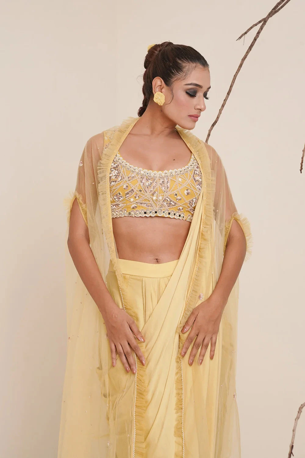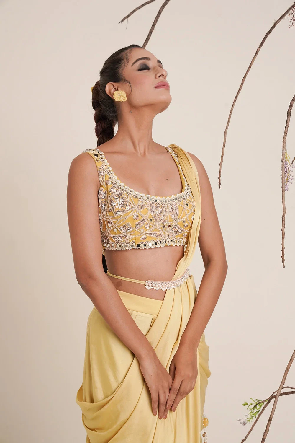 Yellow Pre-drape Saree With Blouse In Mirror Work And Pallu Back Is Embellished In Long Tassel Highlight Until Knees.