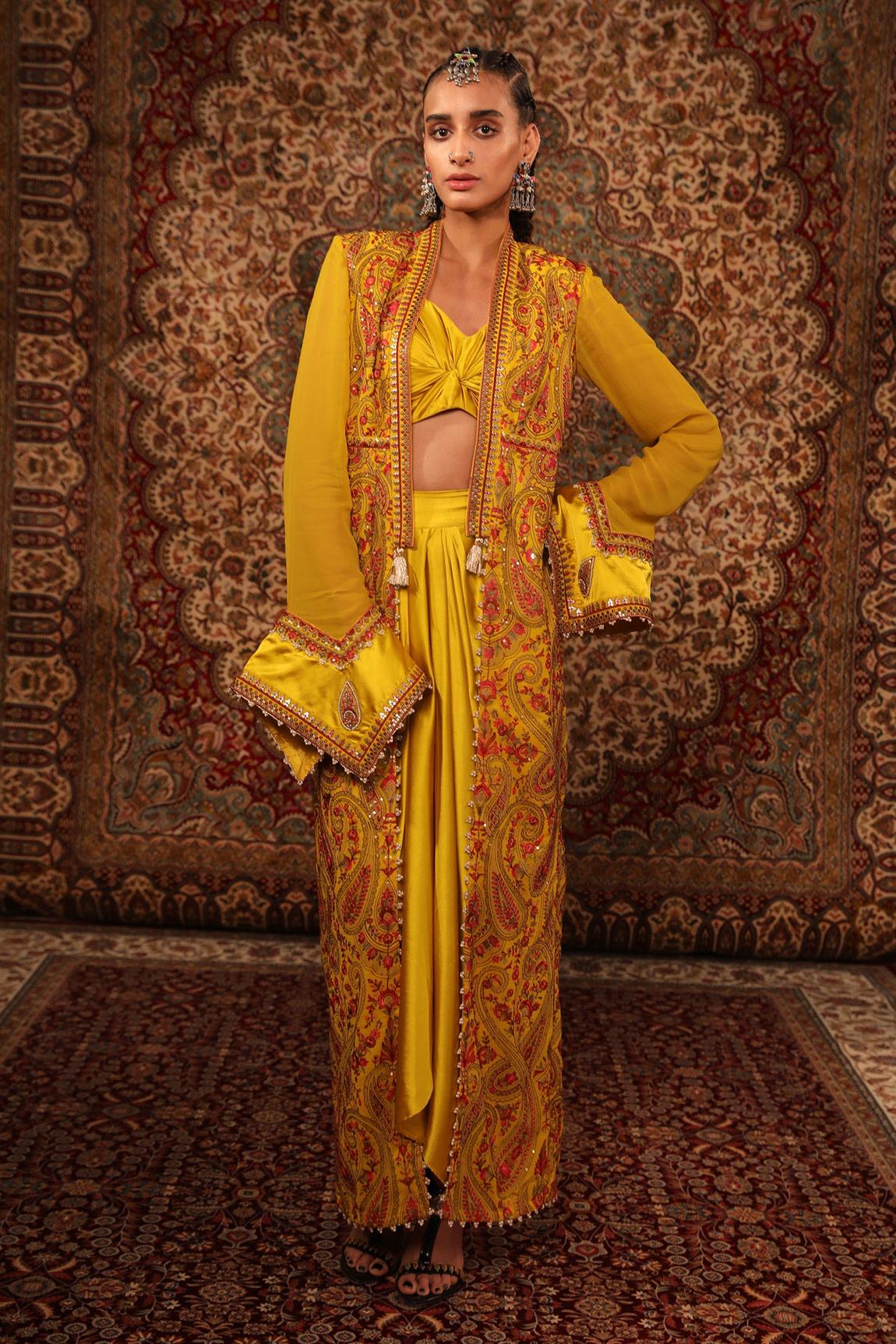 Mustard woven satin jacket with all over jamawar pattern kashida embroidery, cut work bell sleeves & open collar. Paired with front knotted sweetheart neck blouse & pleated cowl draped skirt.