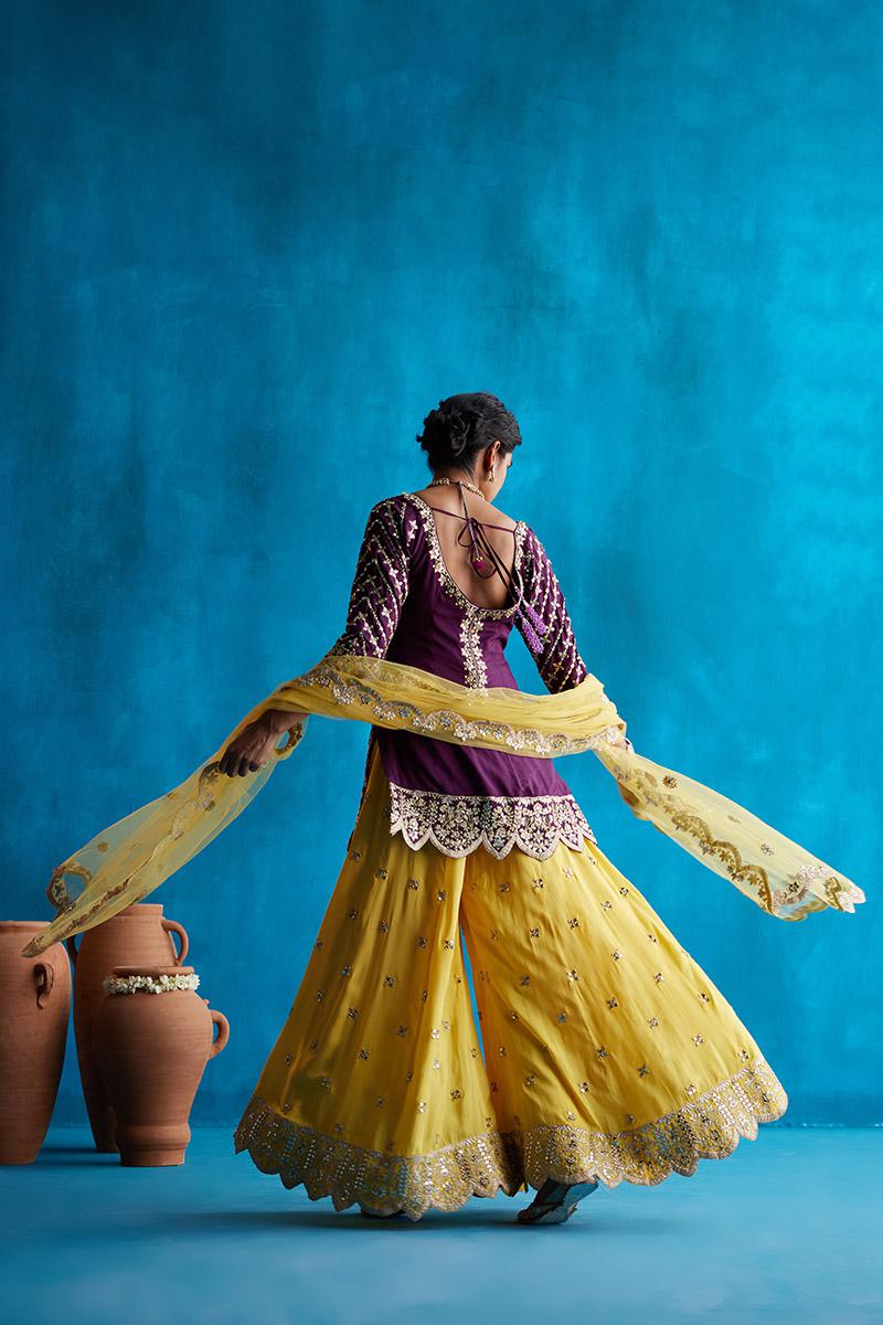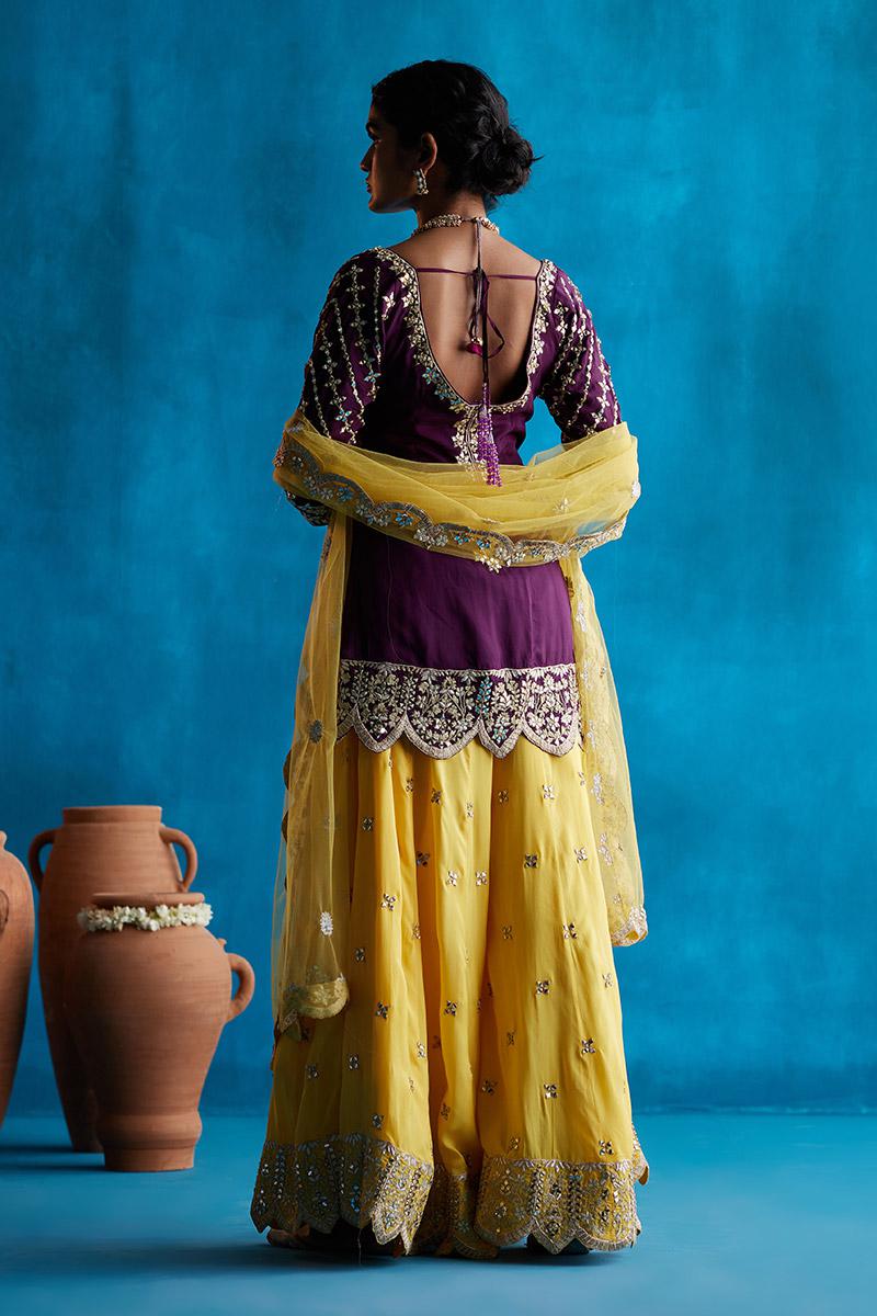 Wine short kurta with gota Patti trims and mirror work. Comes with a yellow sharara and net dupatta.