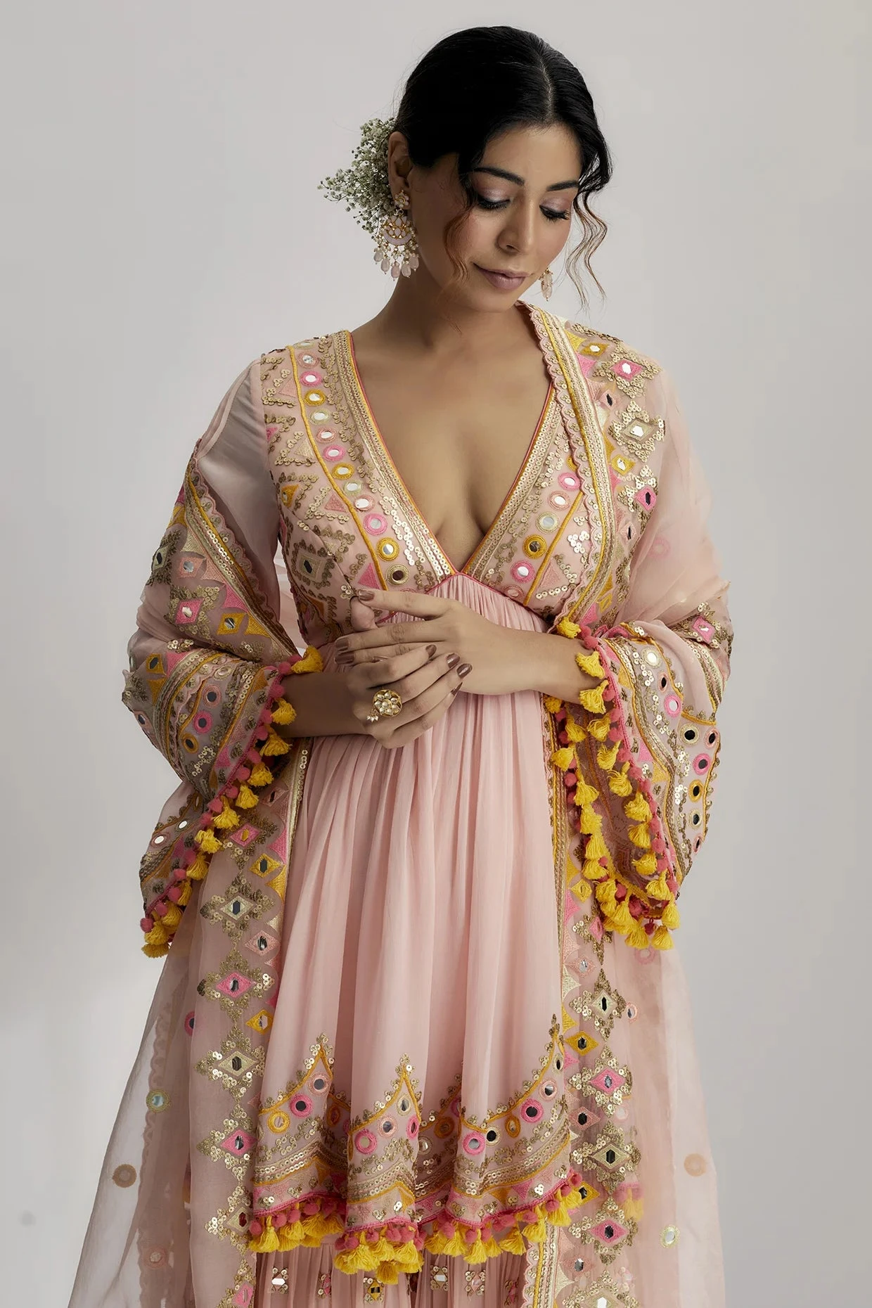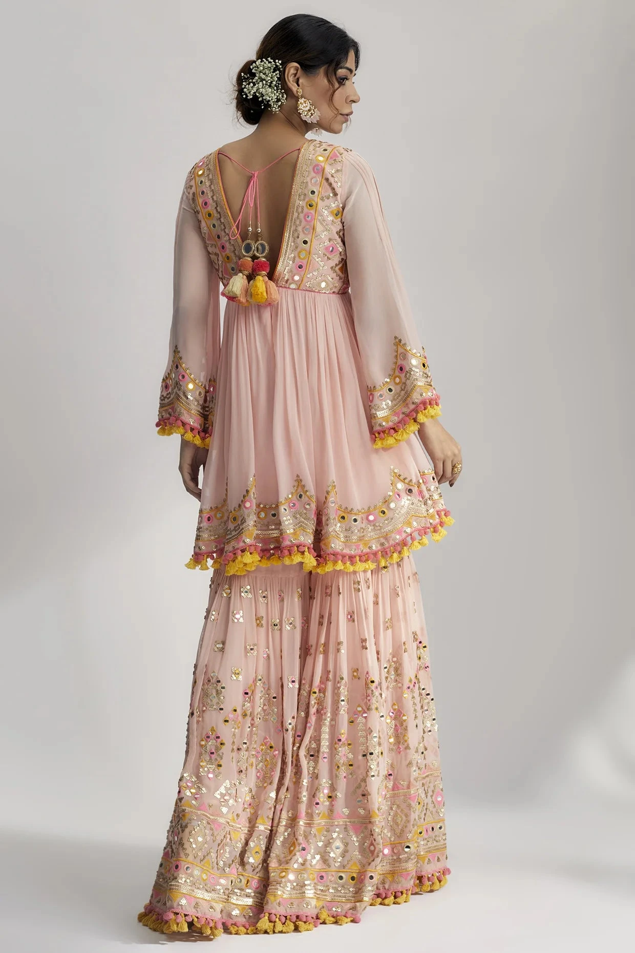The Zohra Peplum With Sharara With Mirror Work And Pompoms And Tassels With Detailed Hand And Machine Embroidery Is Perfect For Festive Occasions Such As Weddings, Parties, And Cultural Celebrations. Embrace The Timeless Beauty And Elegance Of This Outfit, And Make A Statement Wherever You Go.